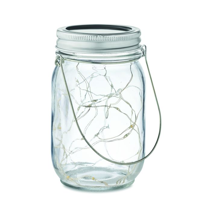Lampă solară de exterior în formă de borcan cu 20 de lumini cu LED. Cârlig în partea de sus. Timp de funcționare de aproximativ 5 ore. Baterie 300 mAh NI-MH inclusă. IP44.