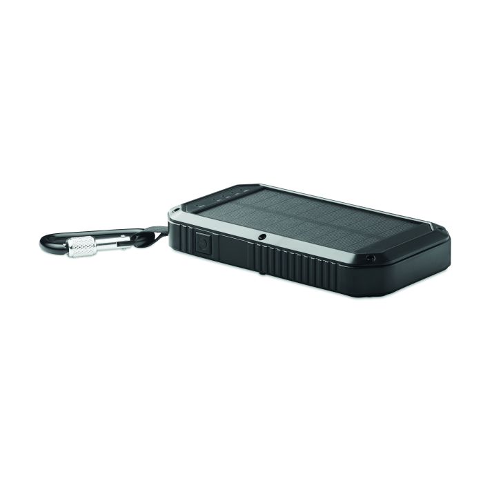 Powerbank solar de 8000 mAh cu funcție de iluminare. Include 21 de lumini LED, cablu USB cu conector micro USB și carabinieră. Putere DC5V/1A și DC5V/2A.