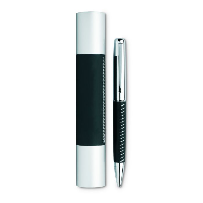 Pix metalic cu finisare argintie cromată şi aplicaţii din piele, în tub din aluminiu. Mină neagră.