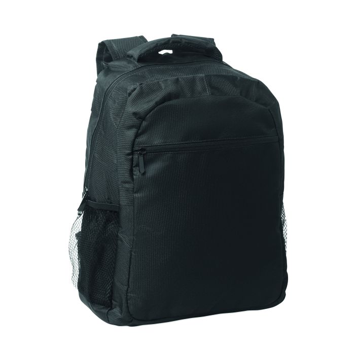 Rucsac pentru laptop 15inch din poliester 600D RPET cu compartiment căptușit pentru laptop în interior, buzunare cu plasă pe ambele părți și buzunar frontal cu fermoar.