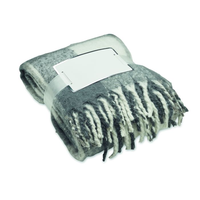 Pătură din RPET poliester mohair cu design în carouri și franjuri rulate manual. Înfășurată în panglică și compliment card imprimabil inclus.