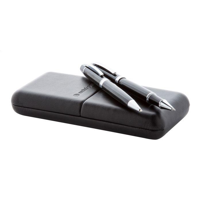 Pix şi roller elegant,metalic, cu accesorii cromate, lucioase. În cutie din înlocuitor piele, mină albastră.