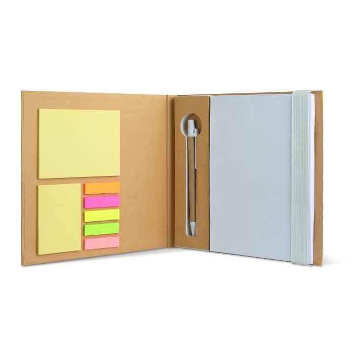 Caiet cu copertă din carton reciclat. 100 de file simple. 3 tipuri de notițe autocolante. Blocuri de notițe autocolante galbene de dimensiuni mari și medii și 5 markere de pagină de culori diferite. Pix cu buton asortat, corp de hârtie. Cu închidere elastică. FSC®-certified | FSC MIX, P7.1, FSC-C213206