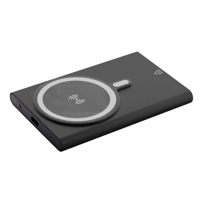 Baterie externă din aluminiu reciclat, cu încărcător rapid wireless magnetic încorporat (15 W) și baterie de 5000 mAh. Cu intrare USB-C și port pentru încărcător. Include inel metalic autoadeziv pentru a utiliza funcția magnetică pe orice dispozitiv wirless. Compatibil cu iPhone® 12 sau mai nou. Inclusiv cablu de încărcare USB.