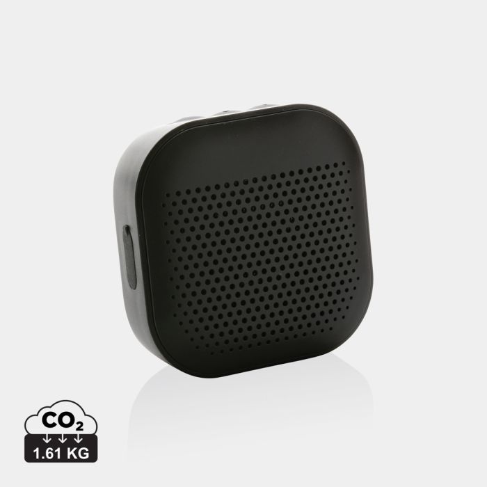 3W wireless speaker made with RCS (Recycled Claim Standard) certified recycled ABS. Total recycled content: 41% based on total item weight. RCS certification ensures a completely certified supply chain of the recycled materials. The speaker is equipped with a 400 mAh battery to ensure up to 3.5 hours of playing time and BT5.3 for smooth connection with clear sound. Connection range up to 10 metres. With mic to answer calls. Packed in FSC® mix box. Including RCS certified recycled TPE charging cable. Item and accessories 100% PVC free. IPX 4 waterproof.