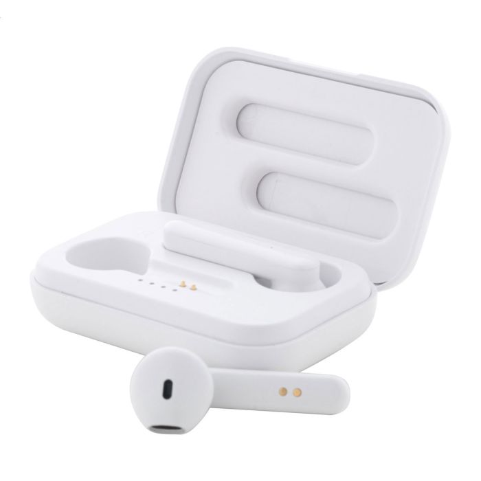 Căști bluetooth, din plastic ABS reciclat, cu funcție de apel hands-free, în carcasă din plastic pentru încărcător, cu baterie de 400 mAh. Inclusiv cablu de încărcare USB.