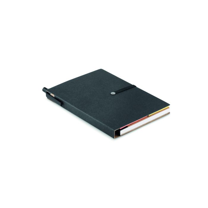 Caiet cu notițe autocolante și pix. Copertă moale, din carton reciclat. 140 de pagini liniate (70 de file). Blocuri de notițe autocolante galbene de dimensiuni mari și medii și 4 markere de pagină de culori diferite. Pix cu buton asortat, realizat din carton reciclat cu accesorii ABS. Mina de culoare neagră. Închidere elastică. FSC®-certified | FSC MIX, P7.1, FSC-C213206