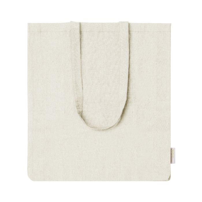 Sacoșă de cumpărături, din bumbac reciclat, cu burduf, mânere lungi și etichetă distinctivă din bumbac reciclat. 100% bumbac reciclat, 140 g/m².