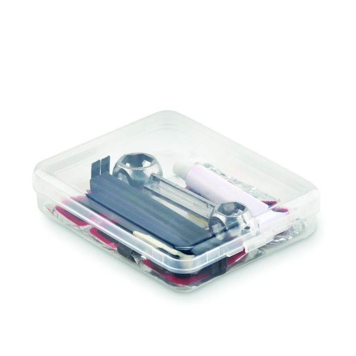 Set de reparații pentru biciclete cu 1 cheie, 2 pârghii pentru anvelope, 1 lipici, 2 capace de supapă, 2 tuburi de supape, 1 răzătoare, 5 plasturi de reparații. Prezentat în cutie transparentă.
