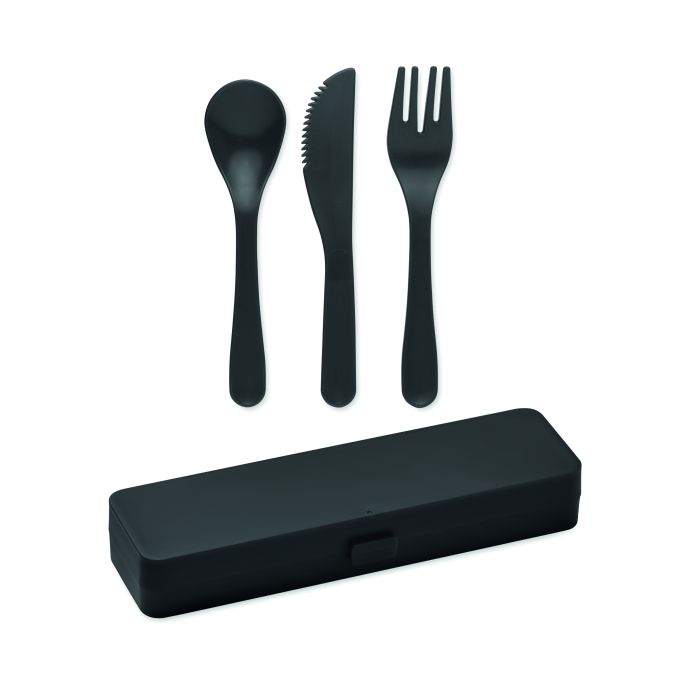 Set de tacâmuri portabile reutilizabile din PP și husă. Include lingură, furculiță și cuțit.