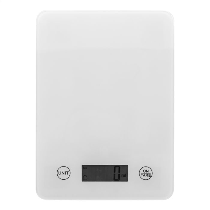 Cântar de bucătărie digital, cu platformă de cântărire din sticlă securizată și baterie reîncărcabilă USB încorporată (200 mAh). Capacitate: 5 kg, gradație 1 g, unități de măsură: g/oz. Cu indicator apă/lapte ml. Include cablu de încărcare USB.