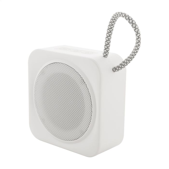 Boxă wireless, din ABS reciclat, cu curea de transport, plasă metalică și baterie reîncărcabilă (300 mAh). Cu funcție de redare MP3 cu card micro SD. Include cablu de încărcare USB.