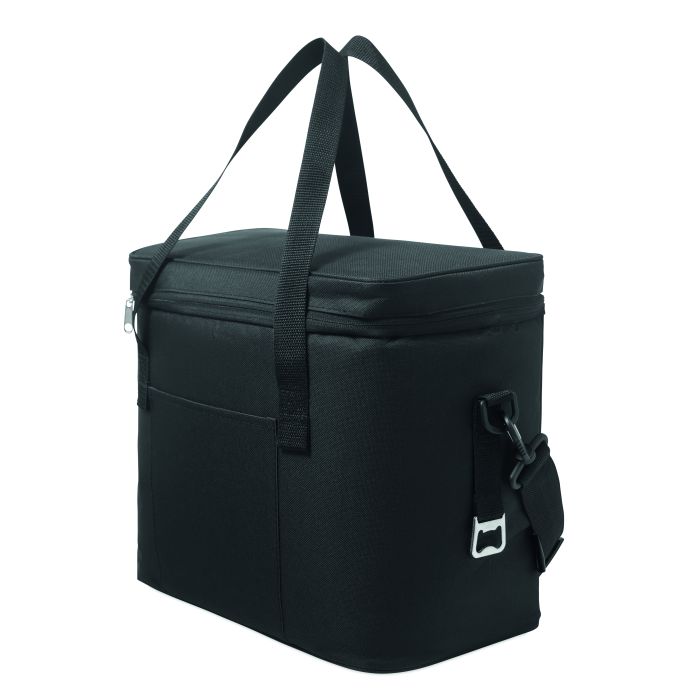 Cooler bag in 600D RPET polyester with PU coating. With 1 front pocket and 1 inner mesh pocket. Isolation PEVA lining with 6mm PE foam. Includes 2 handles and 1 adjustable shoulder strap. Capacity 18L