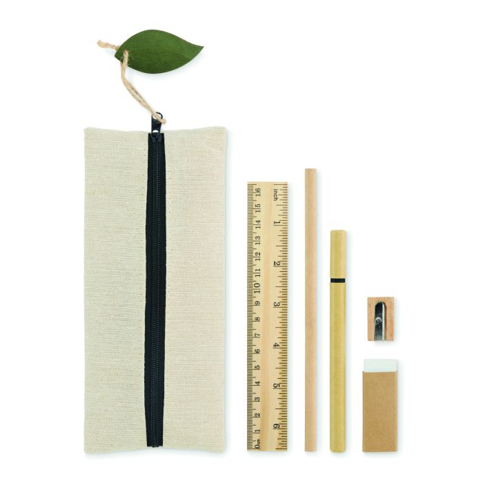 Stationery set in polyester (70%) and cotton (30%) pouch including wooden 15cm ruler, wooden pencil, paper barrel ballpen, eraser and wooden sharpener. Natural look and reusable pouch.