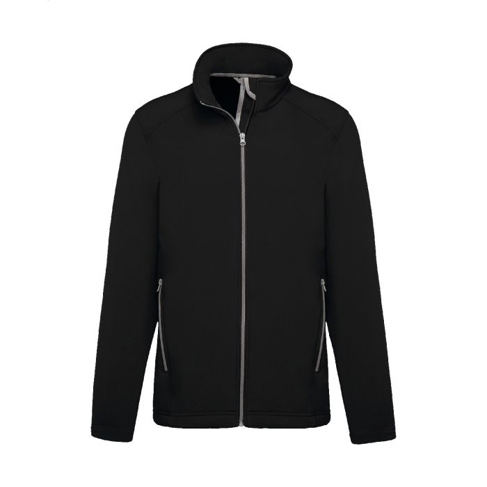 Jachetă softshell cu dublu strat, cu fermoar și buzunare laterale cu fermoar. Fermoare contrastante. Material hidrofug. Exterior: 95% poliester și 5% elastan. Interior: micro-polar fleece 100% poliester. 300 g/m². Produs marca Kariban.