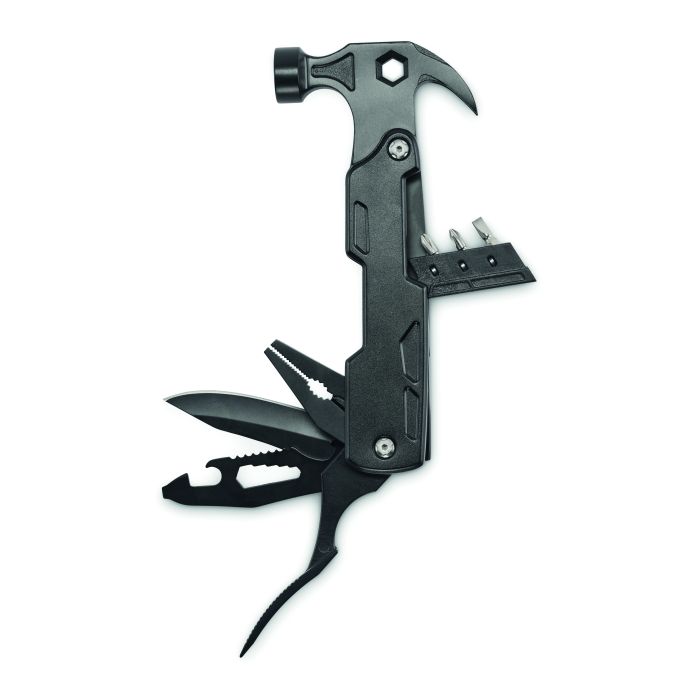 14-in-1 stainless steel multi tool hammer. With nail puller, hex wrench, serrated knife, steel file, variety of screwdrivers, regular pliers, needle-nose pliers, bottle opener, knife, wire cutter.