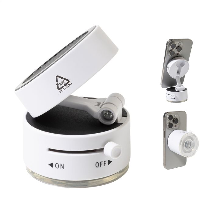 Suport magnetic pentru telefonul mobil, din ABS reciclat, cu fixare prin ventuză. Include inel metalic autoadeziv pentru telefoane fără suprafață magnetică.