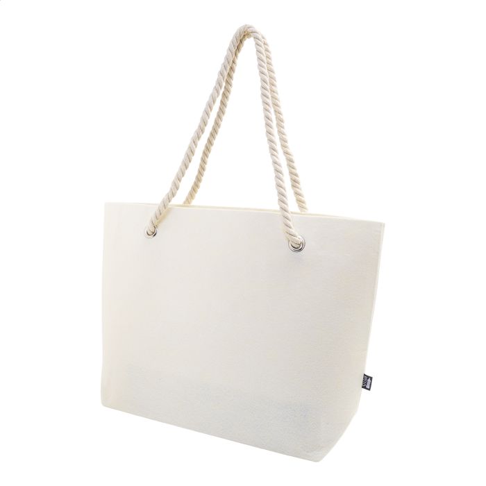 Geantă de plajă sau de cumpărături, din fetru RPET, cu mânere din șnur de bumbac și clin la bază. Cu etichetă distinctivă din RPET.
