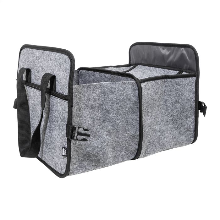 Organizator de portbagaj auto, pliabil, din fetru RPET, cu buzunar frontal cu fermoar, mânere lungi și catarame laterale pentru depozitare convenabilă. Include un compartiment de depozitare deschis și un compartiment frigorific cu fermoar și căptușeală din aluminiu. Cu etichetă distinctivă RPET.