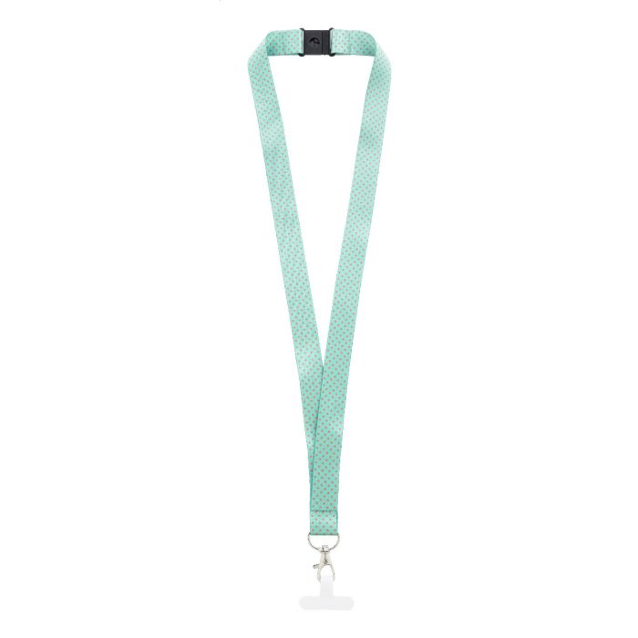 Lanyard cu suport de telefon mobil, din RPET, realizat la comandă, cu carabină metalică, cataramă de siguranță și inserție de telefon din hârtie rezistentă la rupere. Grafică imprimată prin sublimare pe ambele părți. MOQ: 100 buc.