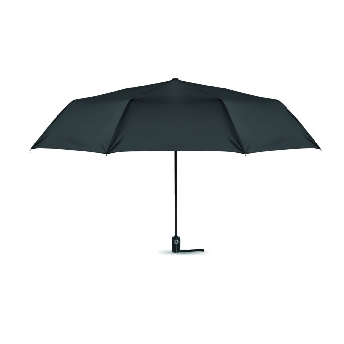 Umbrelă rezistentă la vânt de 27 inch cu 3 pliuri, deschidere/închidere automată. Material 190T pongee 190T, ax din oțel placat cu negru. Cadru din fibră de sticlă, placare neagră în 1 parte în interiorul cadrului. Mâner PP negru cu buton. Cu husă asortată.