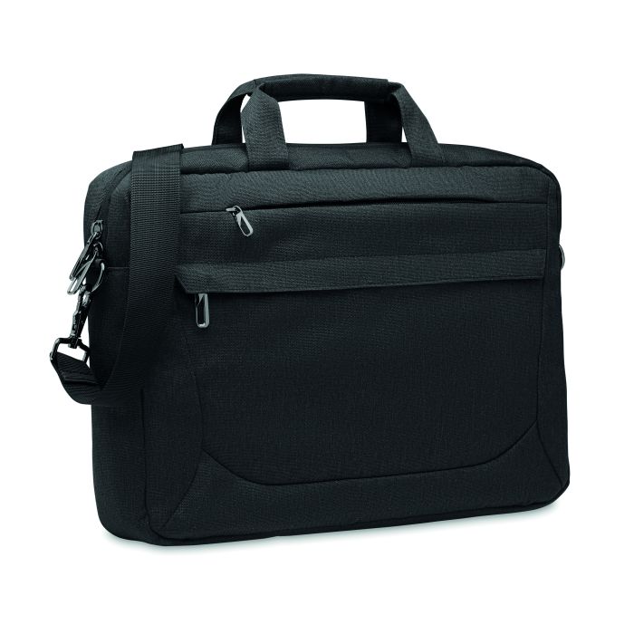 Geantă pentru laptop de 15 inch din poliester 600D RPET. 2 compartimente interioare principale și buzunar frontal mare cu fermoar. Include un buzunar mic cu fermoar. Curele de umăr detașabile și reglabile. Suport pentru troler pe partea din spate.