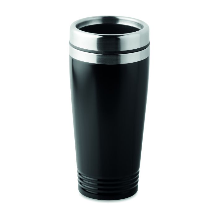 Cană de voiaj, din oțel inoxidabil, cu perete dublu, cu capac negru PP. Capacitate: 400 ml.