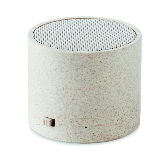 Boxă wireless 5.1 în paie de grâu (35%) și ABS (65%) cu finisaj de cauciuc și lumină LED. 1 acumulator Li de 300 mAh inclus. Date de ieșire: 3W, 3 Ohm și 5V. Timp de funcționare de aprox. 2h.