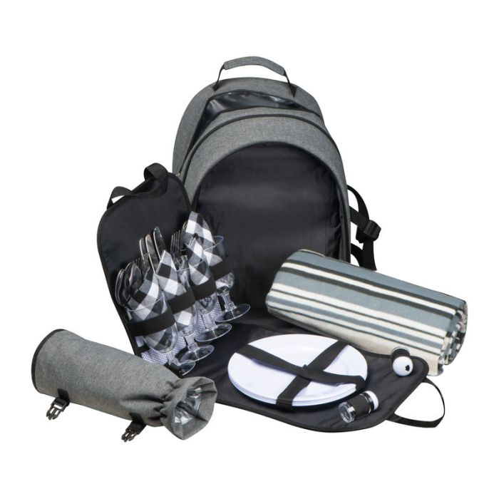 Rucsac picnic pentru 4 persoane, sunt incluse patru farfurii, pahare, tacâmuri, solniţă şi piperniţă, o pătură de picnic și un suport pentru sticle.