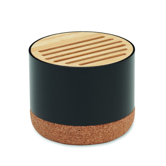 Boxă wireless 5.3 în carcasă din aluminiu reciclat, cu bază din plută și detaliu din bambus în partea superioară. 1 baterie reîncărcabilă Li-ION 400 mAh inclusă. Date de ieșire: 3 W, 3 Ohm și 5 V. Timp de redare aprox. 3h.