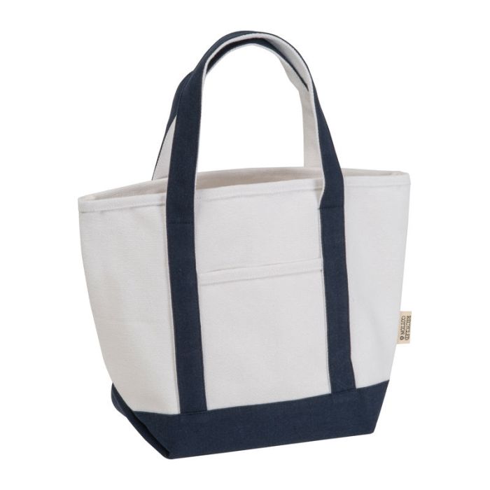 Geantă mică (730 g/m²) din bumbac reciclat, cu două mânere lungi colorate și bază rezistentă. Utilizare versatilă pentru cumpărături, plajă etc.