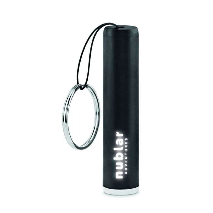 Breloc cu lanternă LED în carcasă ABS cu șnur. 3 baterii AG3 incluse. Corpul include o sursă de lumină care iluminează logo-ul gravat.