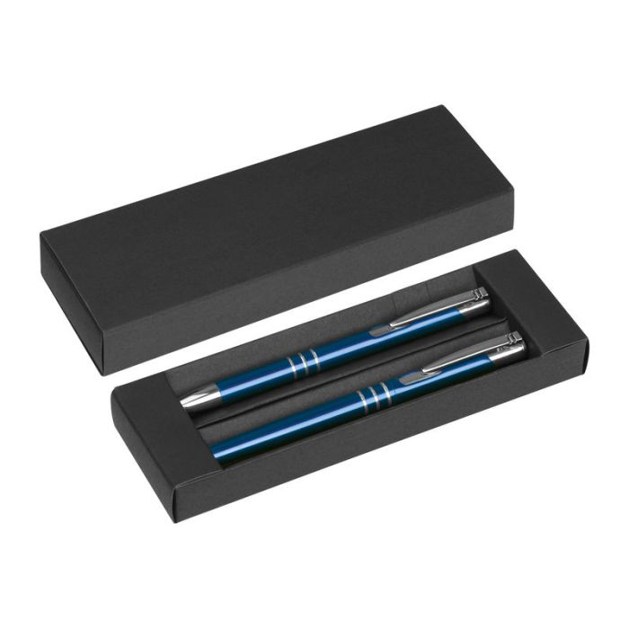 Set de scris din aluminiu, format dintr-un pix cu mină albastră şi un pix Roller.