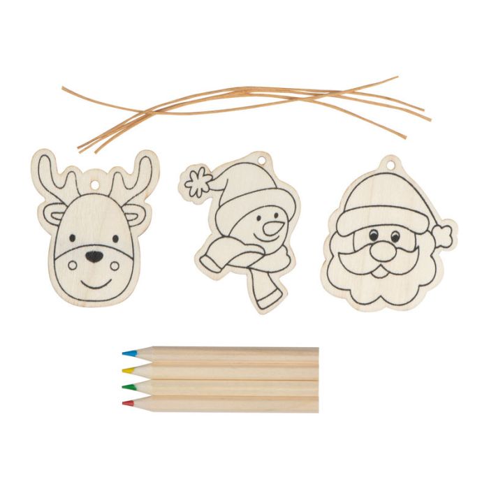Set desenat din 10 parți, acesta conține 3 figurine din lemn, agațătoare și 4 creioane in cutie carton eco-fiendly.