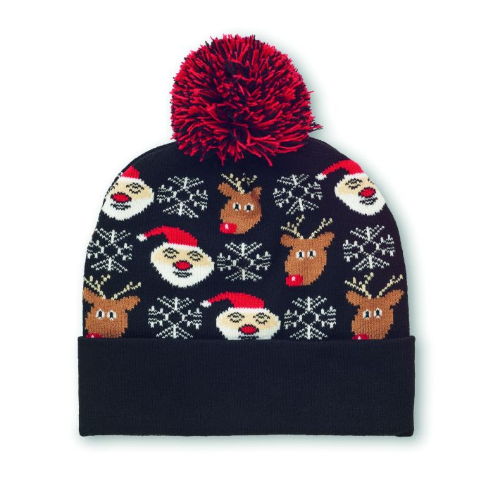 Căciulă tricotată de Crăciun cu manșetă și moț din acrilic moale și elastic.