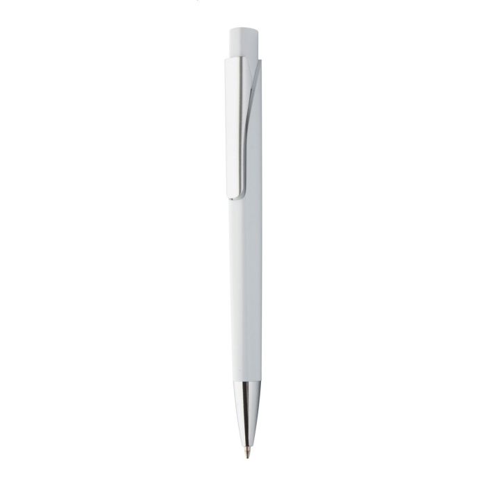 Pix colorat din plastic, cu clips argintiu și vârf cromat, mină albastră.