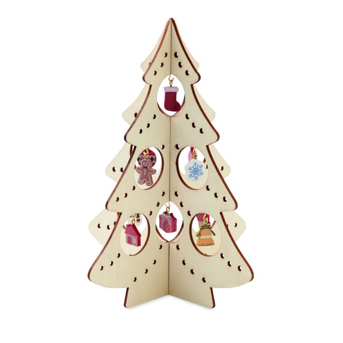 Decorațiune din lemn în formă de brad de Crăciun din placaj cu 10 ornamente asortate. Este necesară asamblarea.