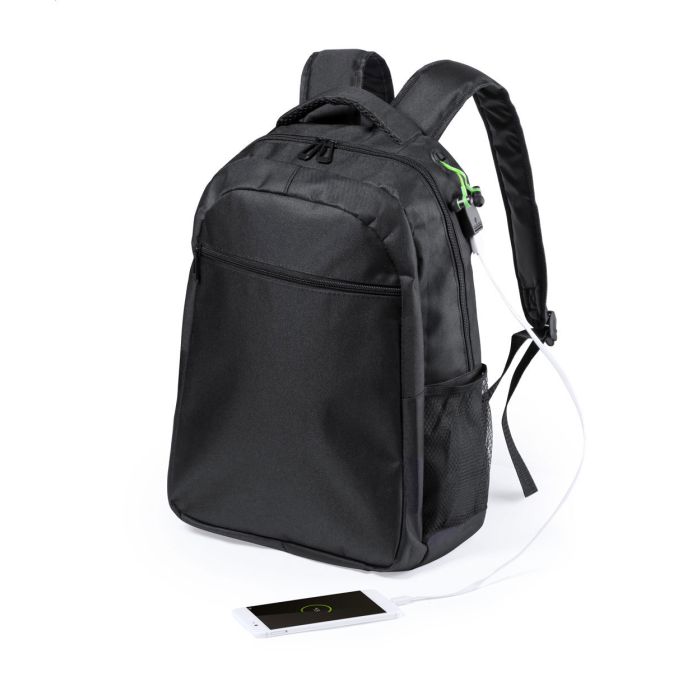 Rucsac rezistent la apă, cu compartiment pentru laptop (15") și tabletă (10"), ieșire pentru căști, conexiune USB încorporată pentru baterie externă. (nu este inclusă), buzunare laterale din plasă, spate și bretele reglabile căptușite. Poliester 600D.