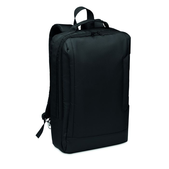 Rucsac pentru laptop din poliester 300D RPET cu curea de umăr căptușită. Geanta are un compartiment principal intern potrivit pentru un laptop de 16' și un cablu de încărcare USB.