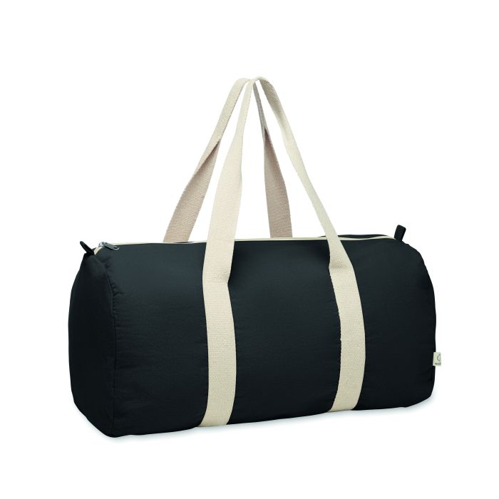 Geantă Duffle, sport sau de voiaj cu compartiment lateral cu fermoar și buzunar interior cu fermoar din bumbac reciclat 320 gr/m² (80%) și poliester reciclat (20%) cu mânere lungi.