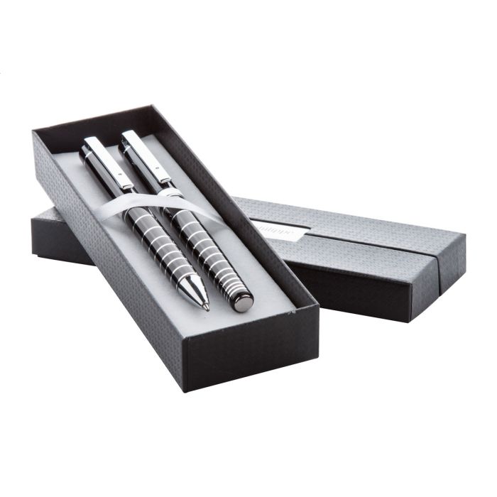 Set elegant, André Philippe, din aluminiu. Setul conţine un pix şi un roller. Corp lucios, inele cromate. În cutie neagră de cadou, mină albastră.
