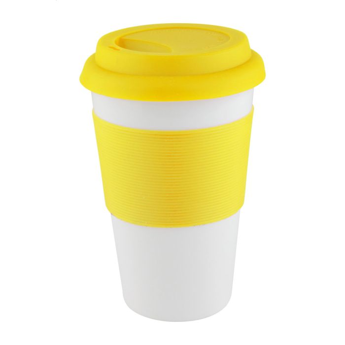 Cană ceramică cu dispozitiv de prindere şi capac din silicon, 400 ml.