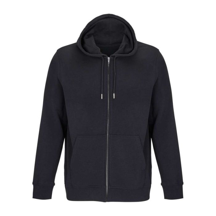 Quality: French terry 300 , 85% combed organic cotton - In conversion - 15% recycled polyester , 3 yarns , Unbrushed interior , Outer fabric: 100% organic cotton - In conversion , Style: Cut and sewn , Set-in sleeves , 2x2 ribbed cuffs and bottom , Kangaroo pocket , Jersey lined hood , Drawstring with metal eyelets and stoppers , Front fastening with concealed zip , Metal zip and puller , Jersey half moon and neck tape inside collar ,