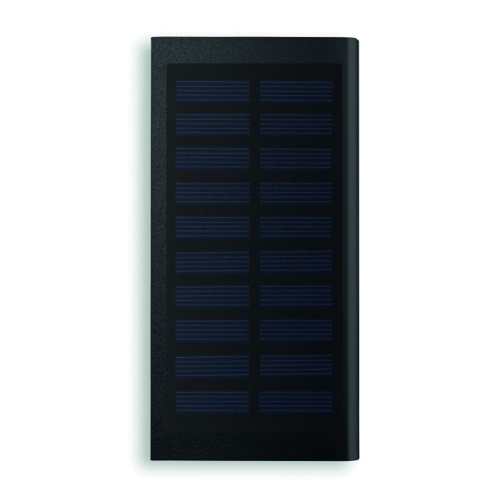 Baterie externă solară de 8000 mAh, din aluminiu reciclat, cu panel solar. Compatibil cu telefon, curent ieșire DC5V/1A și DC5V/2A. Prevăzut cu indicator de lumină și cablu USB cu micro-USB.
