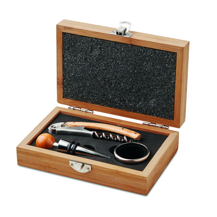 Set pentru vin în cutie din bambus. Include: tirbușon, manșon și dop din inox și bambus. Bambusul este un produs natural, în consecință pot apărea diferențe de culoare, dimensiune sau desen.