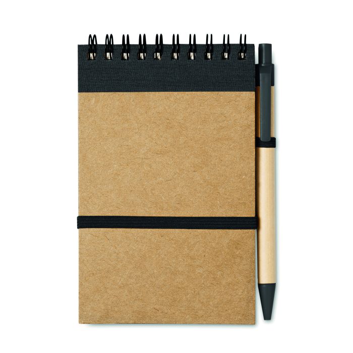 Agendă A6 din hârtie reciclată cu pix asortat și cu spirală. 140 de pagini simple (70 de file) din hârtie reciclată. Bandă de închidere elastică și buclă pentru pix în culoare asortată. Pix cu buton, cu corp din carton reciclat și accesorii din plastic biodegradabil de culoare asortată. Mină albastră. FSC®-certified | FSC MIX, P7.1, FSC-C213206