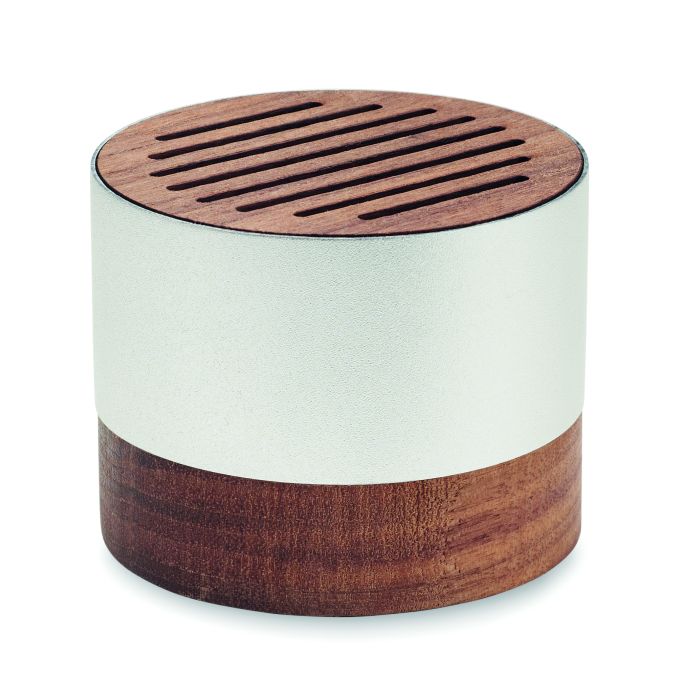 Boxă wireless 5.3 în carcasă din aluminiu reciclat cu bază și detaliu superior din nuc. 1 Baterie reîncărcabilă Li-ION de 300 mAh inclusă. Date de ieșire: 3W, 3 Ohm și 5V. Timp de redare aprox. 3h.