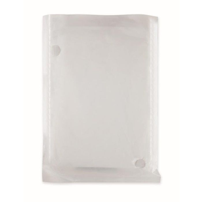 Poncho pliabil cu glugă din material biodegradabil și împachetat în husă biodegradabilă.