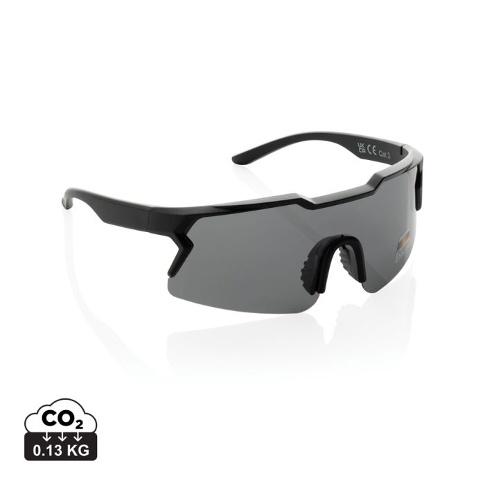 Sport design polarized sunglasses made with RCS certified recycled PC frame. Total recycled content: 50% based on total item weight. RCS certification ensures a completely certified supply chain of the recycled materials. Including recycled RPET sleeve to store the glasses in .The lenses are polarized which eliminates reflecting sunlight, making it ideal for sports and outdoor activities. Conform EN ISO 12312-1, UV 400 and CAT 3. Packed in FSC® gift packaging.