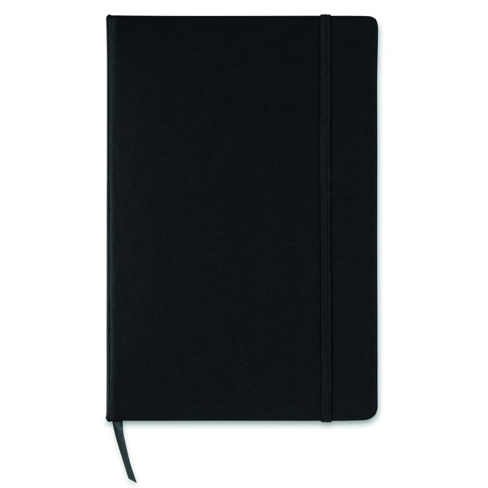 Agendă A5 cu copertă tare din PVC. Bloc lipit. 192 pagini de matematică (96 file) din hârtie reciclată. Închidere elastică de culoare asortată și panglică semn de carte.